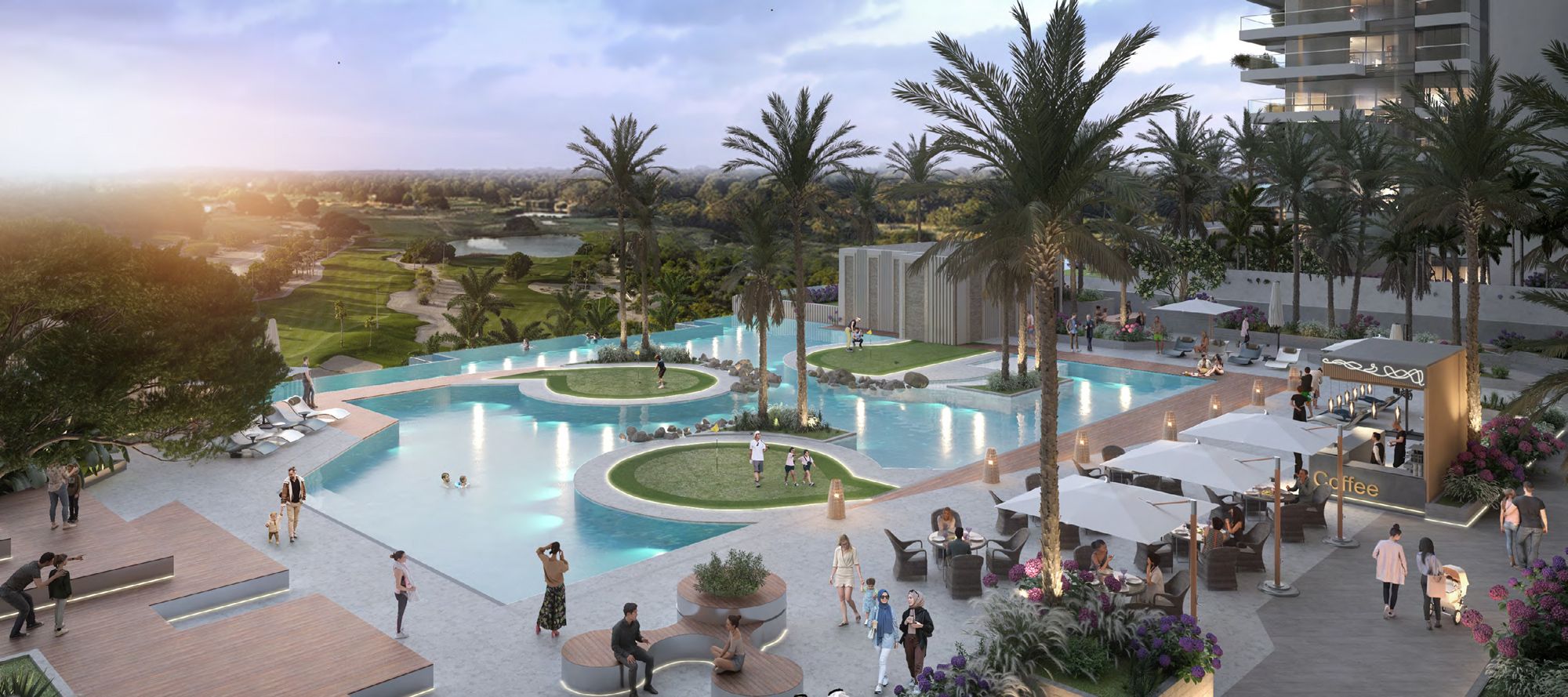 Living in Golf Greens comes with an array of amenities. The development offers a magical aqua garden, infinity pools with relaxing decks, island greens surrounded by crystal-clear pools, and an indoor golf simulator for night-time golfing and skill enhancement. Additional features include a chill-out lounge, a juice bar, and access to the Malibu Bay wave pool, BBQ area, cricket field, volleyball court, football court, tennis court, jogging track, skate park, green parks, food trucks, a petting zoo, and a fishing lake. Moreover, the renowned Trump International Golf Club is within walking distance of the development, offering exceptional golfing experiences.