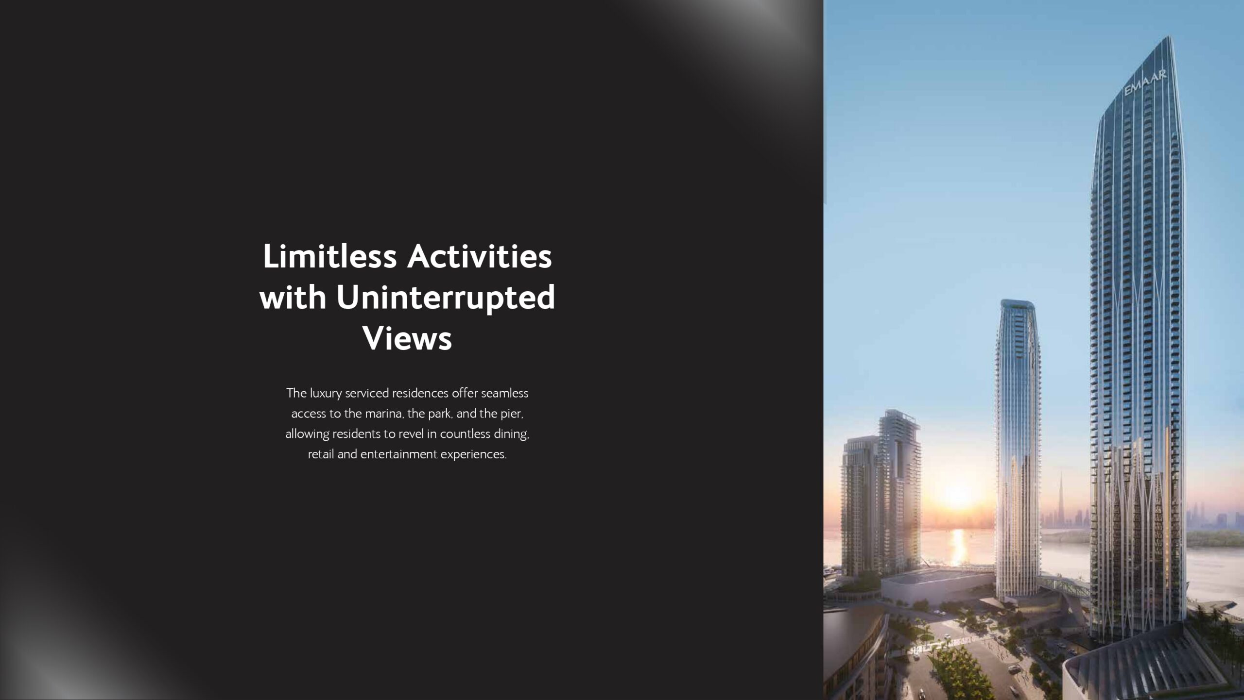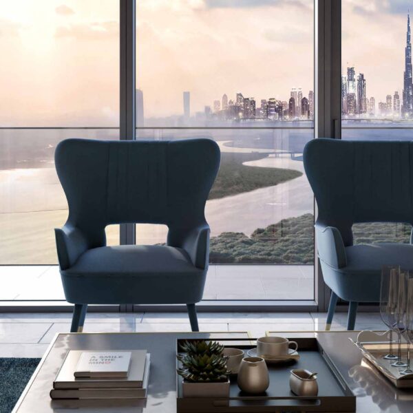 Serving as a captivating visual gateway to the surrounding district, the towers provide exceptional views of the harbor and the Dubai skyline. Each apartment offers an unobstructed view of the harbor and the iconic Dubai Creek Tower, ensuring a breathtaking living experience. The towers are connected by a glass pedestrian bridge, which not only adds to the architectural charm but also serves as a viewing point for residents and guests.