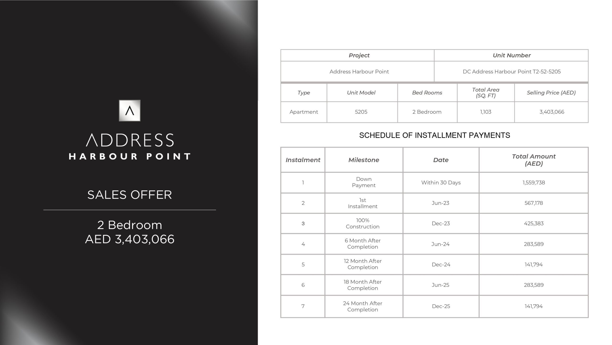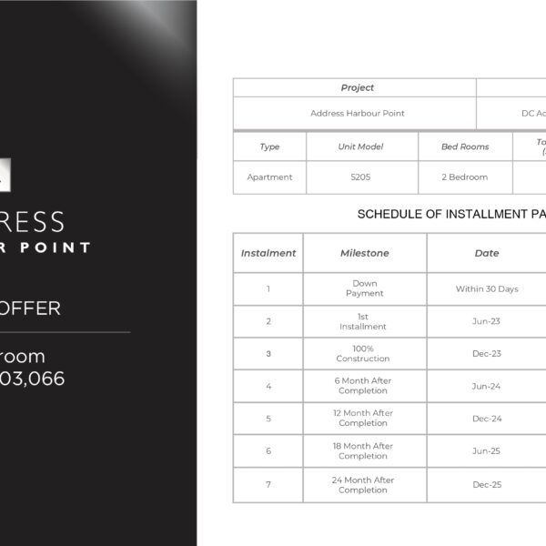 Address Harbour Point is renowned for its elegant design, prime location near the harbor, and a wide range of amenities. The complex enjoys easy access to Dubai’s main landmarks and can be conveniently reached via the city’s main highways. Its strategic position at the intersection of two pedestrian lanes within the district adds to its appeal.