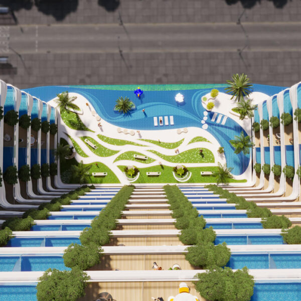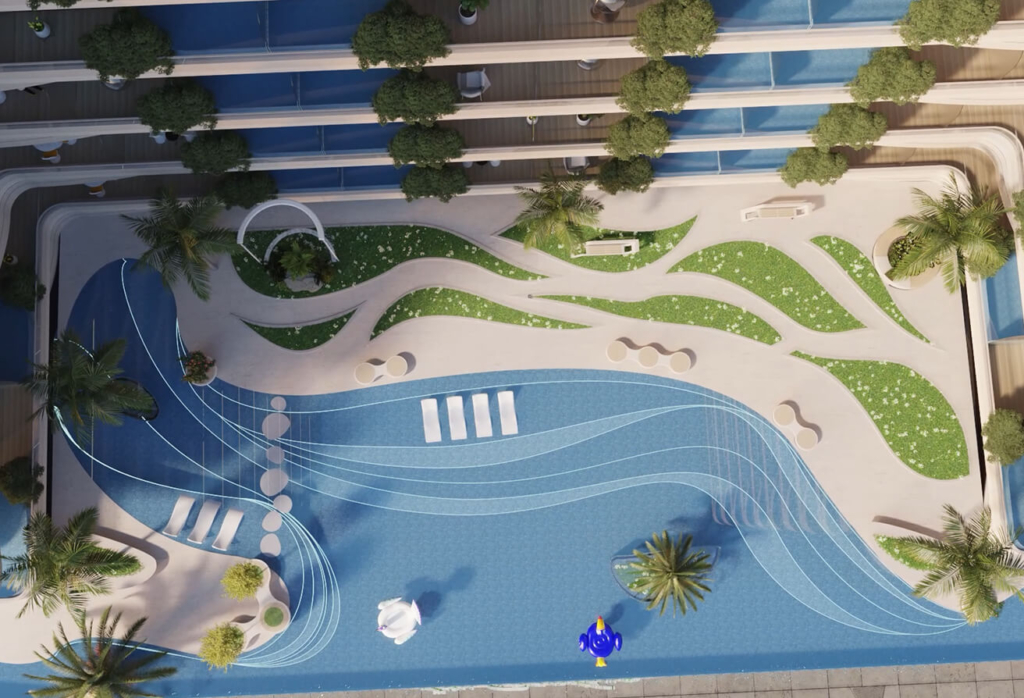 - Leisure pool deck, rooftop infinity pool, and ample green parking areas.